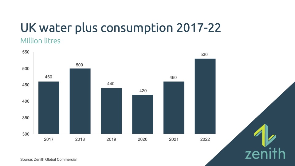 Zenith Global Commercial forecasts continued growth for flavoured and functional waters over the next five years to reach 620 million litres by 2027, 16% ahead of 2022.
